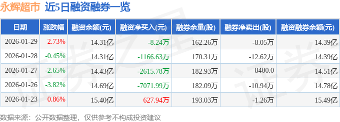 证券之星消息,截至2026年1月29日收盘,永辉超市(601933)报收于4.51元,上涨2.73%,换手率3.38%,成交量307.19万手,成交额13.61亿元。