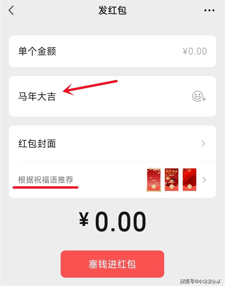 你看,我输入一个【马年大吉】,大家看,系统就会自动根据祝福语,给咱们匹配贴合主题的封面,我们点一下下面的【根据祝福语推荐】就可以看到各种好看的封面了。
