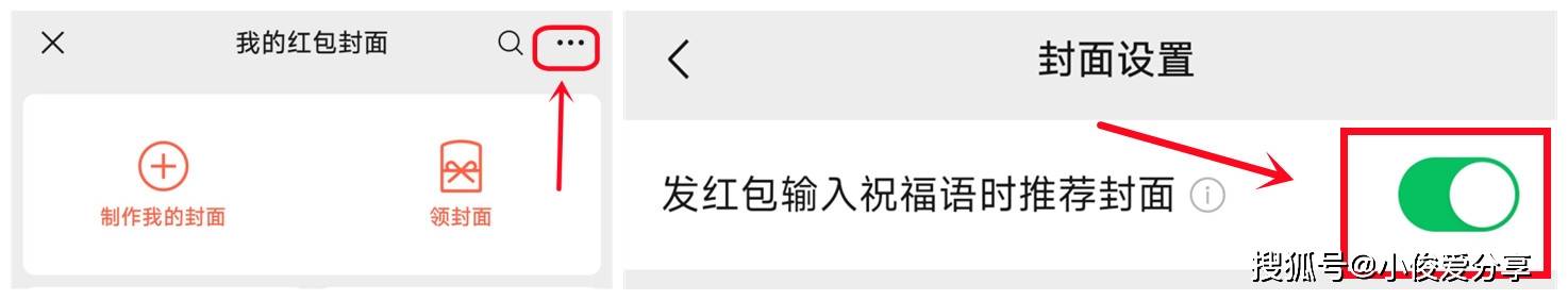 很多人可能会发现,为什么我输入祝福语之后,并没有出现红包封面呢?其实这可能是你没有打开一个开关,这个时候只要点击我的红包封面,接着再点击右上角这里的三个小点,可以看到,在这里呢,就有一个发红包输入祝福语时推荐封面的开关,我们只要把它打开就可以了!