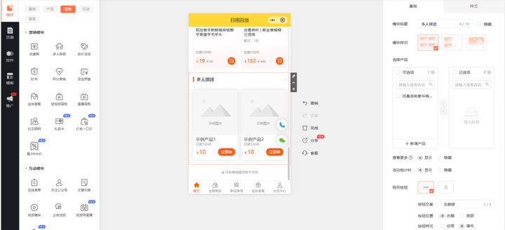 4、然后我们回到编辑设计页面,【模块--产品--营销模块】中选择【多人拼团】并添加进模板中,然后在右侧的编辑栏里选择需要展示的拼团产品。