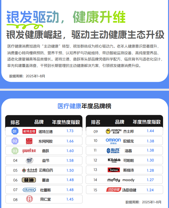 在医疗健康年度品牌榜中,东阿阿胶、云南白药、同仁堂等老字号品牌凭借深厚的品牌积淀和产品功效持续获得市场认可。诺特兰德、汤臣倍健、斯维诗等现代营养保健品牌通过科学配方和创新技术快速崛起,展现出健康消费的新趋势。