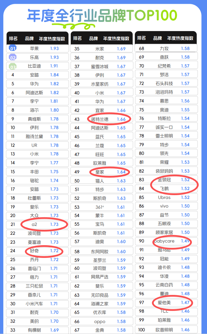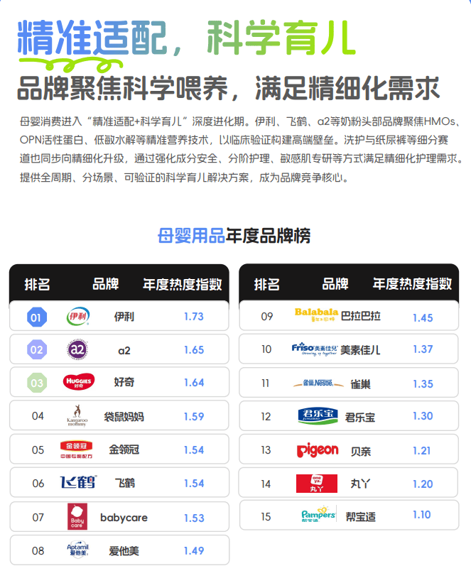 榜单中,多个知名母婴品牌进入年度全行业品牌热度榜单,包括a2、皇家美素佳儿、好奇、金领冠、飞鹤、babycare、爱他美等,这些品牌的热度指数集中在1.47至1.73区间。