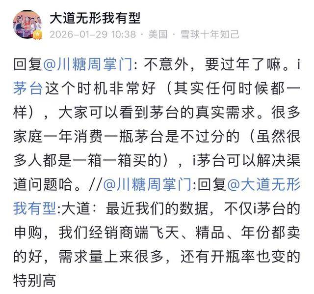 同在1月29日,段永平在社交平台回复网友提问时,进一步表达了对茅台的看好。针对网友提及的“最近我们的数据,不仅i茅台的申购,我们经销商端飞天、精品、年份都卖得好,需求量上来很多,还有开瓶率也变得特别高。”的情况,段永平表示“不意外,要过年了嘛”,并肯定了i茅台模式的价值,认为“i茅台这个时机非常好(其实任何时候都一样),大家可以看到茅台的真实需求。很多家庭一年消费一瓶茅台是不过分的(虽然很多人都是一箱一箱买的),i茅台可以解决渠道问题哈”。他还公开表示,当前贵州茅台的股价“真的不贵”,再次彰显了对茅台投资价值的认可。