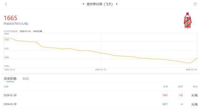 与批发价同步回暖的是终端零售市场。第三方平台“酒价内参”披露的数据显示,1月30日,飞天茅台终端零售均价为1665元/瓶,较前一日大涨38元,涨幅2.3%,创下1月21日以来的价格新高,扭转此前的下跌颓势。在此次反弹之前,飞天茅台终端零售均价曾经历了连续16天的持续下跌,市场情绪较为低迷,并在1月29日创下了1627元/瓶的阶段性新低。这一价格较2025年底的1808元/瓶累计跌幅超过10%,下跌速度和幅度均超出市场预期,引发行业广泛关注。