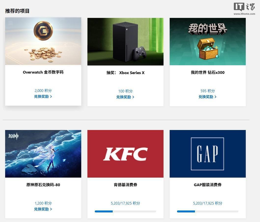IT之家注意到,目前国区用户可以使用 Rewards 积分兑换《守望先锋》金币、《我的世界》代币、《原神》原石兑换码、肯德基消费券、GAP 服装消费券、盒马礼品卡、猫眼礼品卡、中国石化礼品卡、天猫超市礼品卡、沃尔玛礼品卡等奖励。