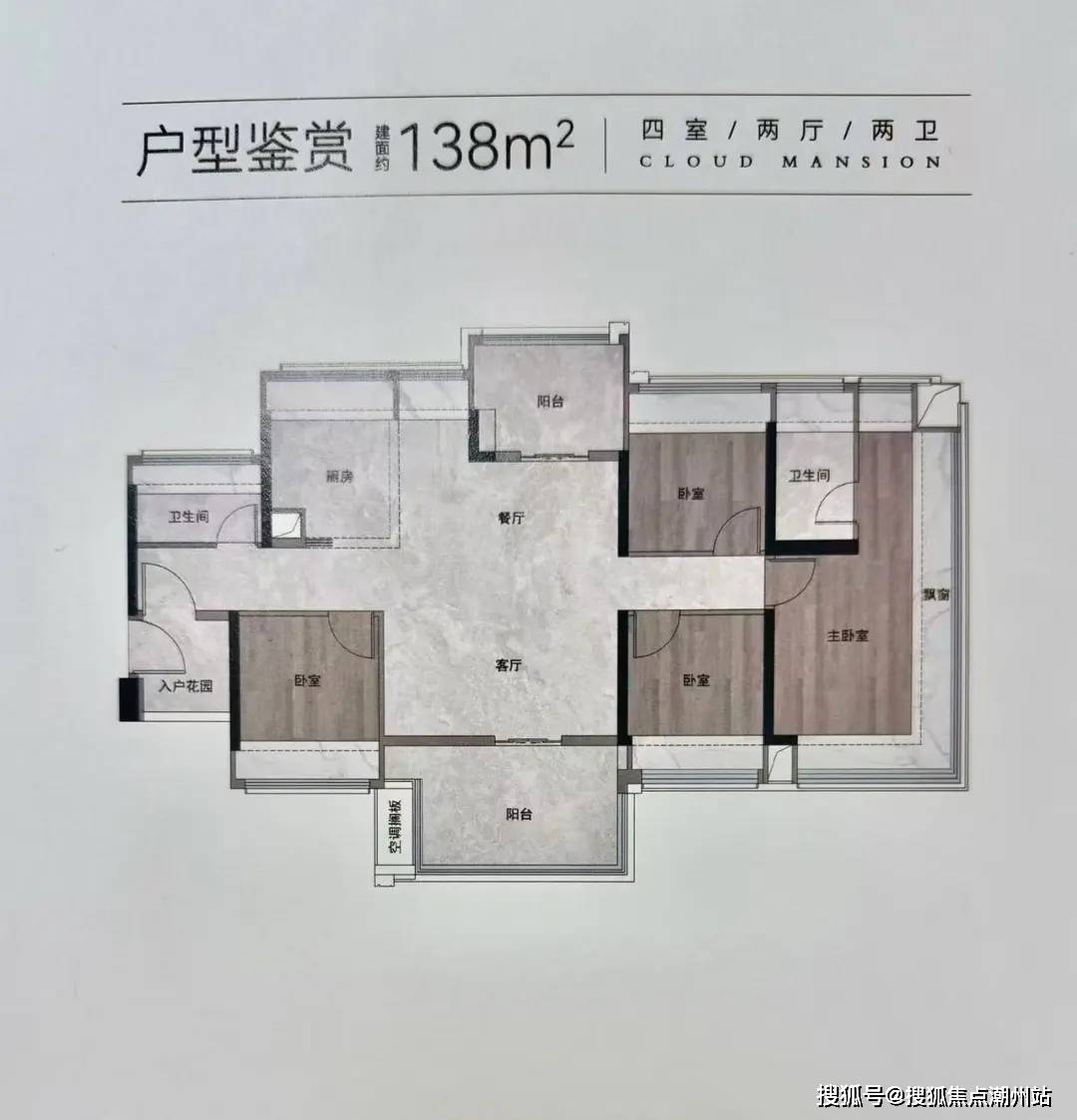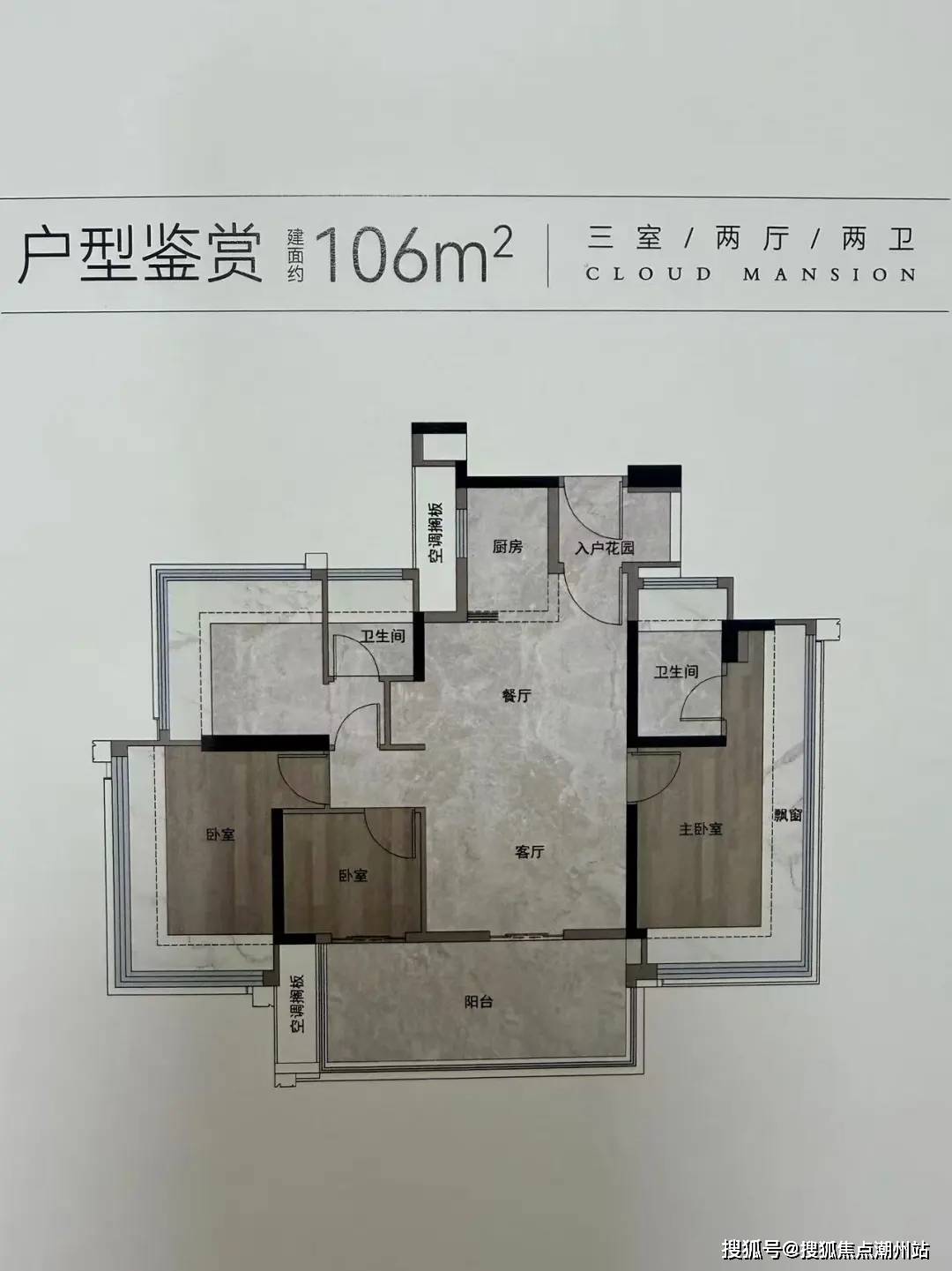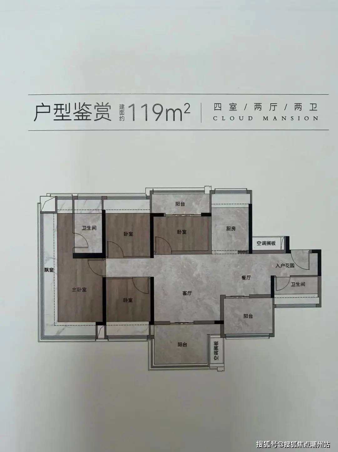 建面约106方,东南朝向四房设计,可以看白云山。做了飞机户型, 主人房和一个次卧能做到270°的大飘窗,景观面更宽。