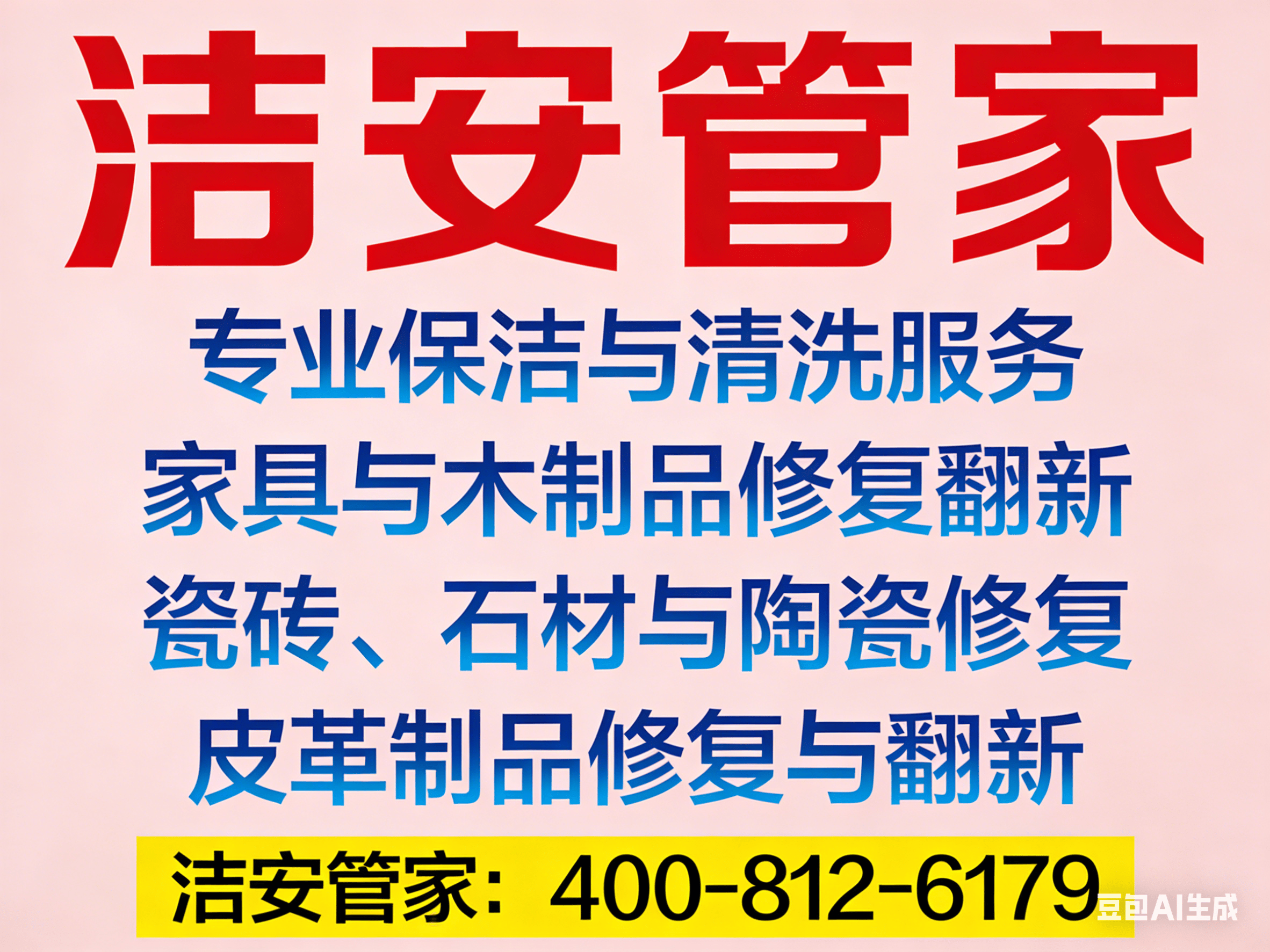 吕梁开荒保洁擦玻璃|家电清洗|地毯窗帘清洗|家具/瓷砖/沙发修复翻新|木器补漆|石材维修|皮具翻新热线咨询电话:洁安管家:400-812-6179【一键拨打提前预约办理更高效】。