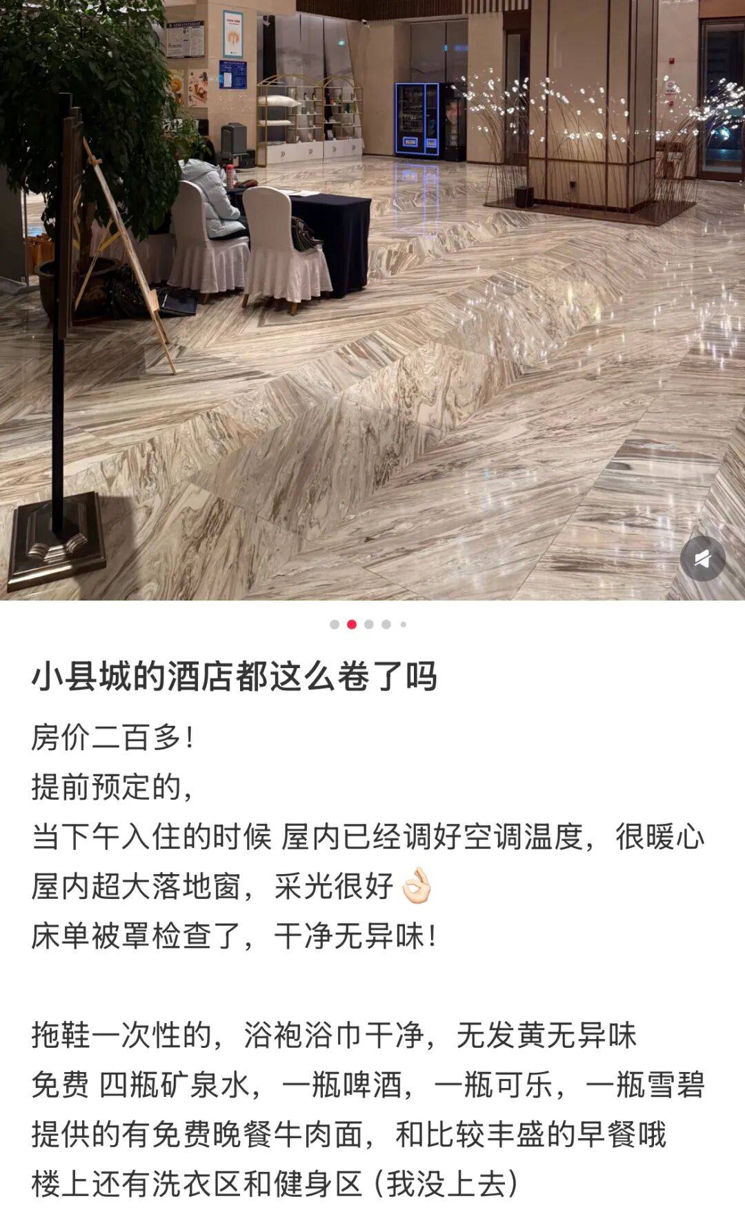 有人入住县城酒店后发现,堪比五星级酒店的品质,房价只要二百多,顶楼还有免费的室内泳池,供自己随意使用。