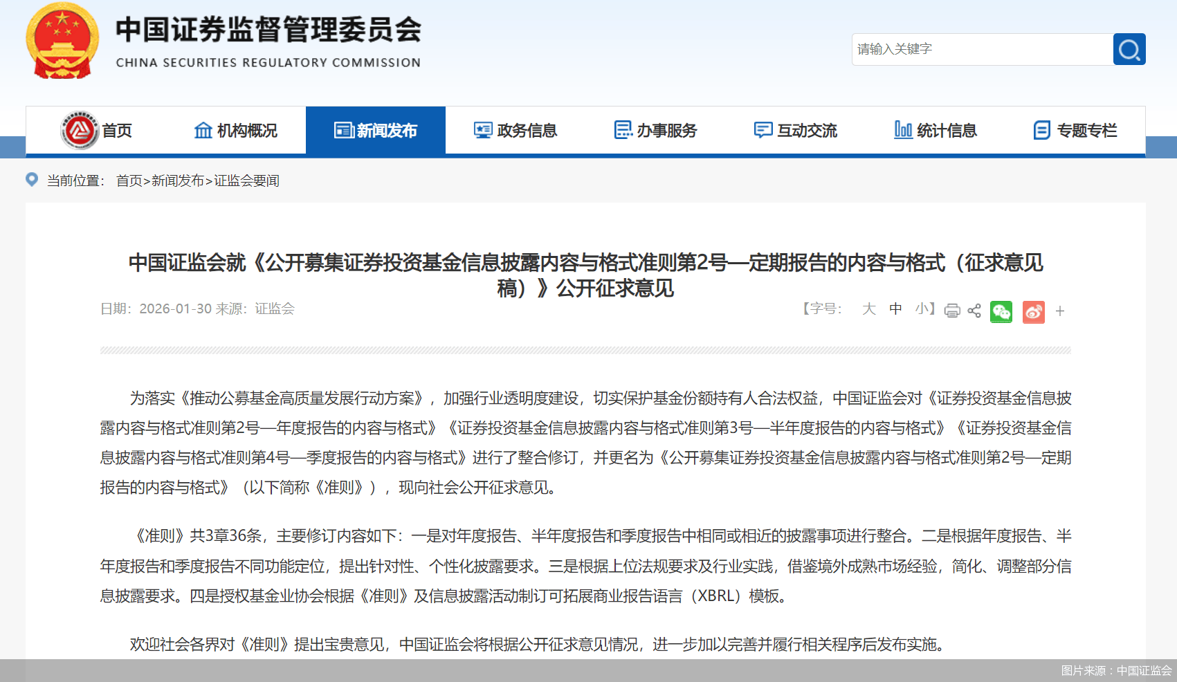 北京商报讯(记者 李海媛)为落实《推动公募基金高质量发展行动方案》,加强行业透明度建设,切实保护基金份额持有人合法权益,1月30日,中国证监会对《证券投资基金信息披露内容与格式准则第2号—年度报告的内容与格式》《证券投资基金信息披露内容与格式准则第3号—半年度报告的内容与格式》《证券投资基金信息披露内容与格式准则第4号—季度报告的内容与格式》进行了整合修订,并更名为《公开募集证券投资基金信息披露内容与格式准则第2号—定期报告的内容与格式》(以下简称《准则》),现向社会公开征求意见。