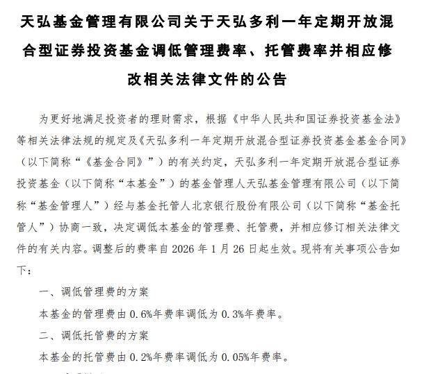 23日,天弘基金发布公告称,决定调低天弘多利一年定期开放混合型证券投资基金管理费、托管费,管理费由0.6%年费率调低为0.3%年费率,托管费由0.2%年费率调低为0.05%年费率。调整后的费率自2026年1月26日起生效。