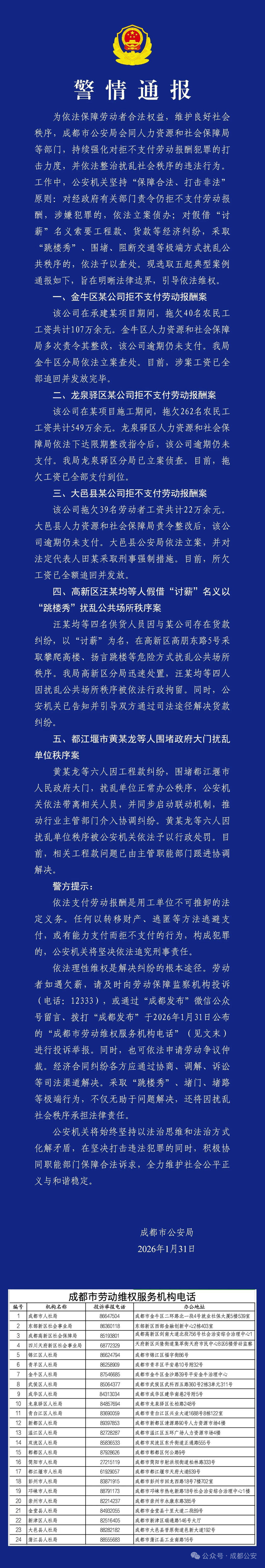1月31日,成都市公安局发布警情通报称,为依法保障劳动者合法权益,维护良好社会秩序,成都市公安局会同人力资源和社会保障局等部门,持续强化对拒不支付劳动报酬犯罪的打击力度,并依法整治扰乱社会秩序的违法行为。