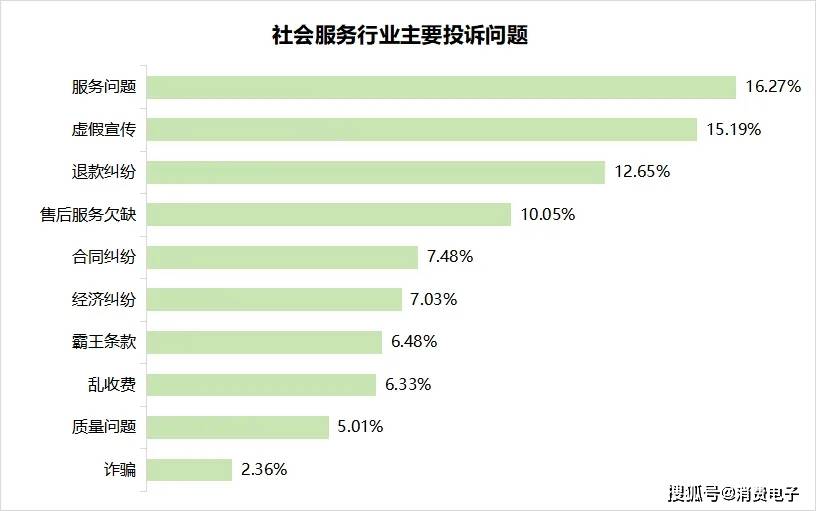 社会服务行业主要投诉问题集中在服务问题、虚假宣传、退款纠纷、售后服务欠缺等方面,其中服务问题占比为16.27%,虚假宣传差次之,占比为15.19%。与此同时,合同纠纷、经济纠纷、霸王条款等问题日益突出,成为消费者投诉的主要内容之一。