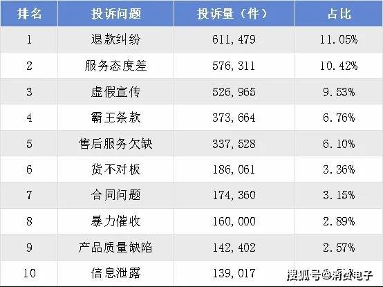 从投诉问题来看,排名前三的分别为:退款纠纷611,479件,占比11.05%;服务态度差576,311件,占比10.42%;虚假宣传526,965件,占比9.53%。此外,霸王条款、售后服务欠缺、货不对板、暴力催收等问题也位居前列。具体如下: