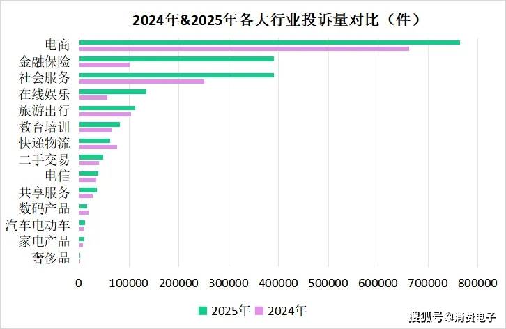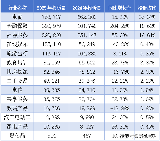 2025年,消费保平台投诉量排名靠前的行业中,电商行业投诉量位居榜首,共763,717件,占投诉总量的36.37%,同比增长15.30%;金融保险行业投诉量排第二,共390,979件,占投诉总量的18.62%,同比增幅高达284.26%;社会服务投诉量为390,860件,占比18.61%,较去年同期增长55.63%。此外,今年在线娱乐行业投诉量翻倍上涨。