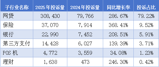 由下表可以看出,金融保险各子行业2025年的投诉情况呈现出显著的分化与高增长特征,其中网贷以79.22%的投诉占比位居各子行业首位,其投诉量较2024年同期增长286.67%,是该领域内投诉量最大且增长明显的板块;保险以9.52%的投诉占比排名第二,同比增长率达到368.41%,增幅在各子行业中尤为突出;银行投诉占比为5.91%,位居第三,同比增长208.51%;此外,第三方支付、POS机与理财的投诉占比依次为3.71%、1.23%与0.42%,对应的同比增长率分别为139.39%、34.08%与246.30%,其中第三方支付和理财的投诉增长呈显著增长态势。