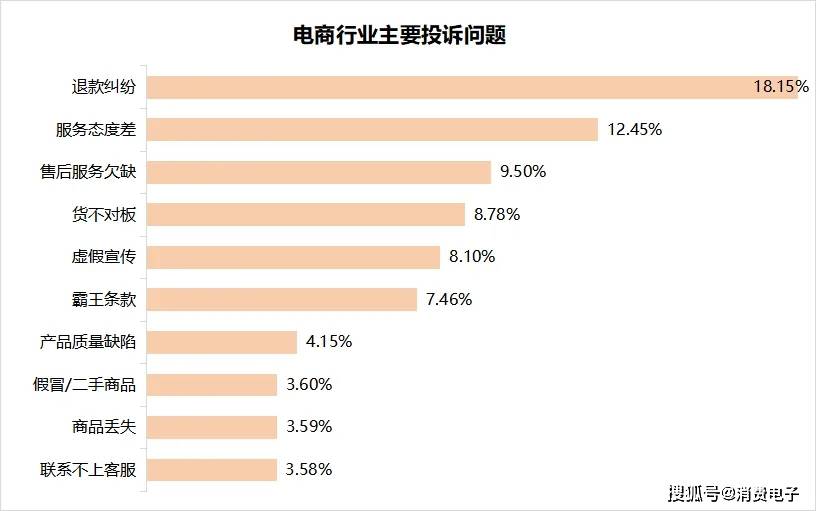 电商行业主要投诉问题集中在退款纠纷、服务态度差、售后服务欠缺、货不对板等方面,其中退款纠纷占比为18.15%,服务态度差次之,占比为12.45%。与此同时,虚假宣传、霸王条款、产品质量缺陷等问题日益突出,成为电商行业消费者投诉的主要内容之一。