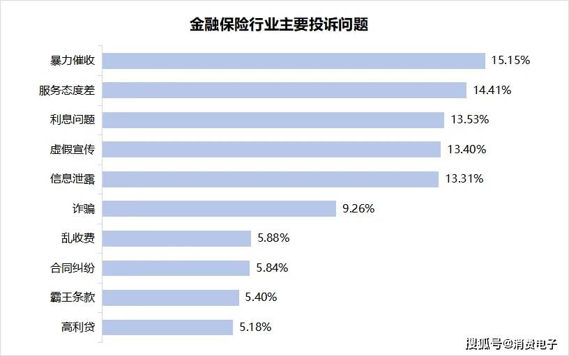 金融保险主要投诉问题集中在暴力催收、服务态度差、利息问题、虚假宣传等方面,其中暴力催收占比为15.15%,服务态度差次之,占比为14.41%。与此同时,霸王条款、诈骗、信息泄露等问题日益突出,成为消费者投诉的主要内容之一。