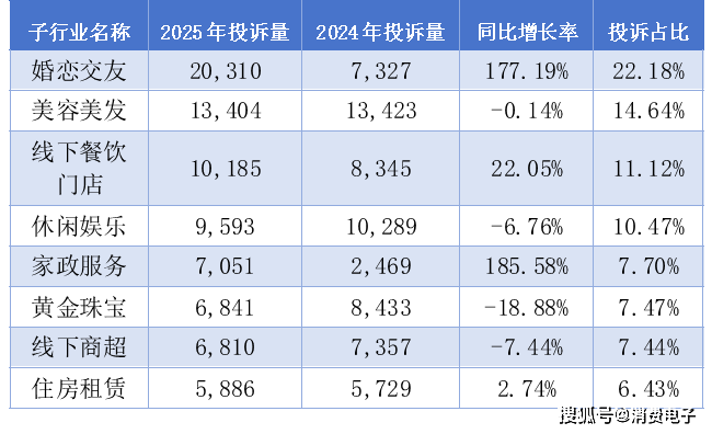 社会服务类子行业中,婚恋交友以20310件投诉量居首,投诉量同比高达177.19%;美容美发以13404件投诉量位列第二,投诉量与2024年基本持平(同比微降0.14%),整体态势相对稳定;线下餐饮门店以10185件投诉量排名第三,投诉量同比增长22.05%。家政服务虽未进入投诉量前三,但185.58%的同比增速尤为突出,投诉量从2024年的2469件跃升至2025年的7051件,侧面体现出家政服务行业快速发展中。
