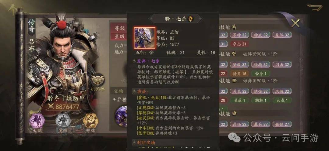 狰·七杀-变异天赋:每回合我方发动的前3个能造成伤害的英雄技时,都可触发【破军】,且触发时使英雄技伤害强度额外+10%;我方发动神通所需基础怒气改为80