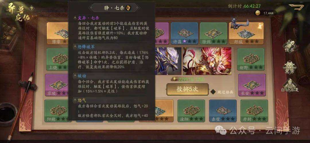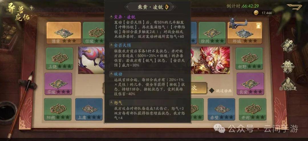 这只异兽请大家都记一下,这是技能将最适合的异兽,没有之一,绝对的统治地位,解决了项羽准备回合异兽难以提供帮助的困难,三次增幅三次急袭,毁天灭地,我今天终于拿到了,虽然只有一星,但是他的强度哪怕没星我也会用