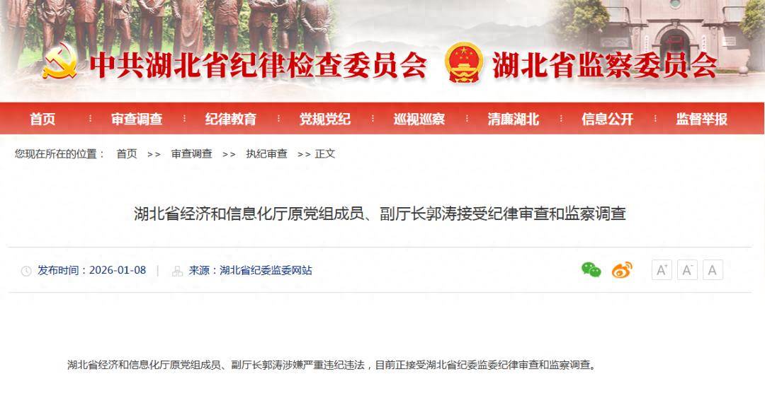 湖北省经济和信息化厅原党组成员、副厅长郭涛涉嫌严重违纪违法,目前正接受湖北省纪委监委纪律审查和监察调查。