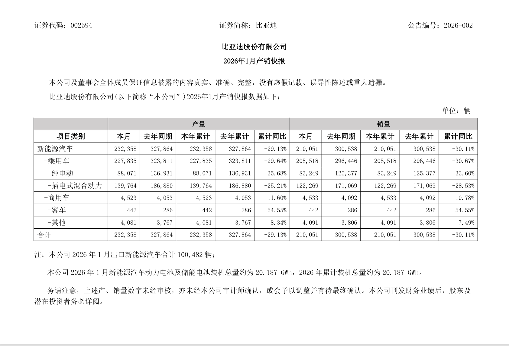网通社快报 2月1日,比亚迪股份发布2026年1月汽车产销快报,披露当月销量及相关业务核心数据,整体呈现“国内承压、出口发力”的态势,商用车板块逆势增长成为亮点之一。