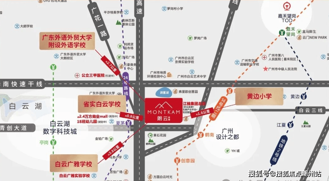 交通便利:项目距离22号线、8号线北延段夏茅站400米,目前施工中,另外还规划有24号线经过此站,小区正门靠近广花一路,临近机场高速、华南快速干线、广州环城高速,交通比较便捷。