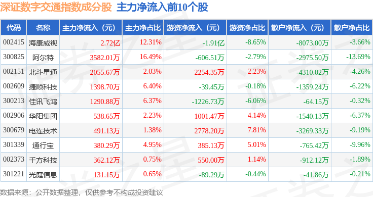 资金流向方面,深证数字交通(970049)指数成份股当日主力资金净流出合计6.32亿元,游资资金净流入合计1.19亿元,散户资金净流入合计5.13亿元。成份股资金流向详情见下表: