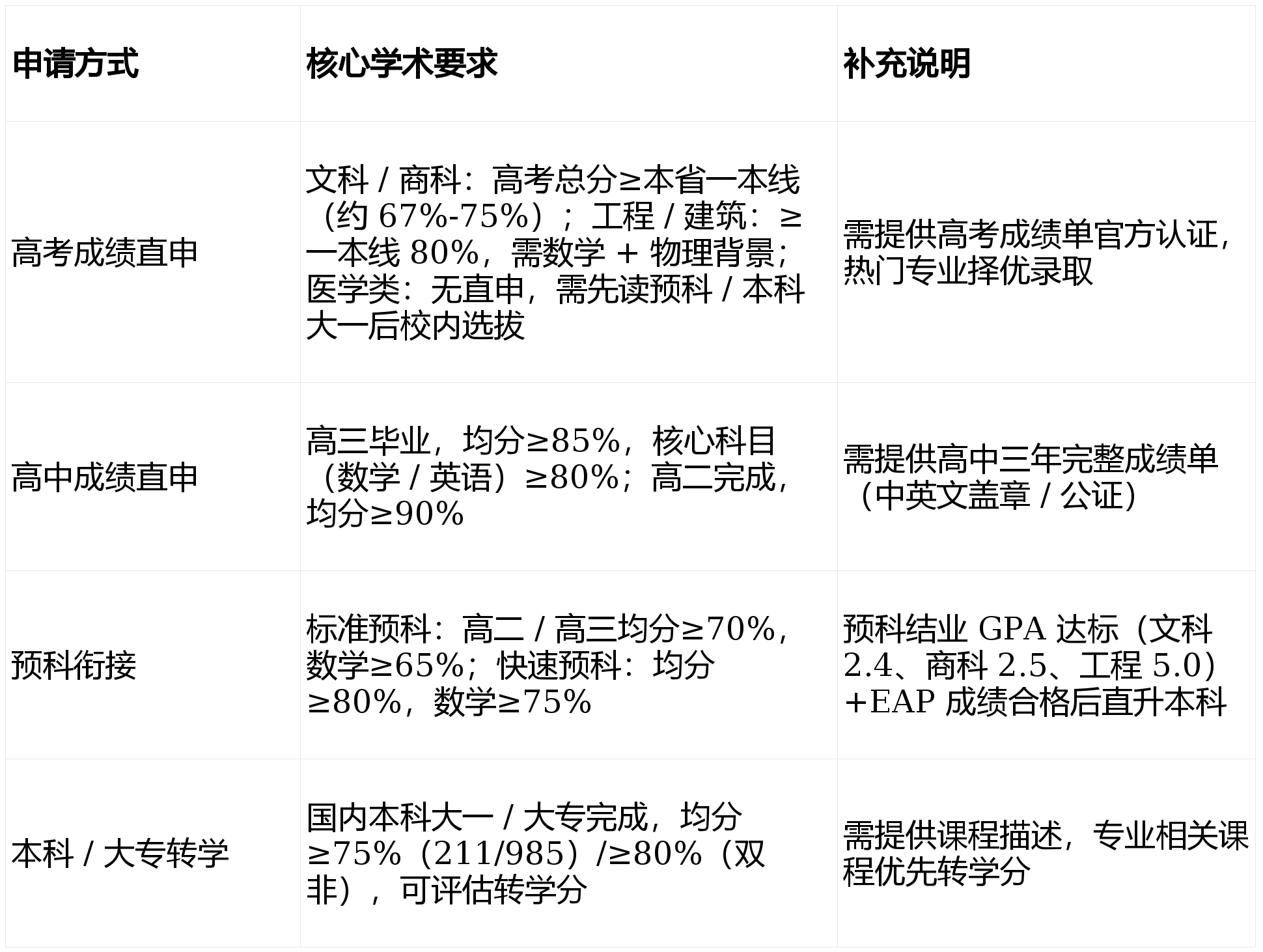 - 工程 / 计算机 / 理科:必须提供高中数学成绩(≥70%),工程需额外物理基础