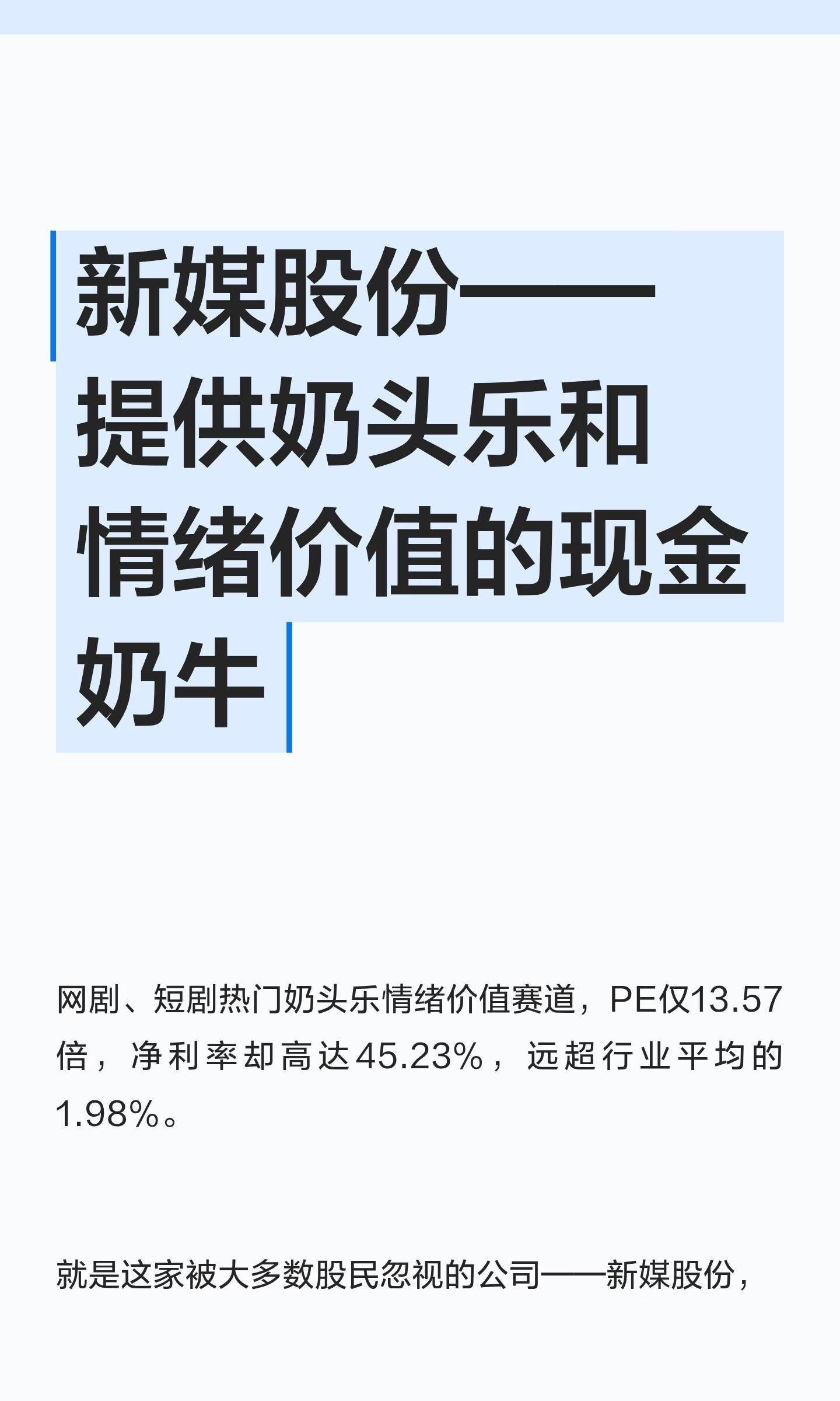 新媒股份——提供奶头乐和情绪价值的现金奶牛网剧、短剧热门奶头乐情绪价值赛道,PE仅13.57倍,净利率却高达45.23%,远超行业平均的1.98%。就是这家被大多数股民忽视的公司——新媒股份,它像一面镜子,照出了A股投资者的集体心理盲区。新媒股份这份财报,最直接的冲击力来自一个数据:净利率41.66%。当整个传媒娱乐行业还在为个位数的净利率挣扎时,这家公司已经悄悄做到了用不到一半的成本创造全额收入。这意味着什么?意味着这家公司拥有极强的定价权和成本控制能力。看一下资产负债表,你会发现更令人安心的细节。公司货币资金占总资产的比例高达43.24%。现金流是企业的生命线。新媒股份经营现金流与利润的比率达到54.94%,表明公司盈利质量高,利润有实实在在的现金支撑。在2026年1月的提案恳谈会上,公司聚焦中短剧、网剧网大、院线电影、少儿动画四大核心赛道。这些领域正是当前内容消费的热点方向。中短剧赛道尤其值得关注,公司参投的剧集已陆续上线播出。技术层面,公司也没落下。基于智能图像识别技术的媒资智能审核集成系统正在研发中,通过人工智能算法实现“千人千面”的个性化内容推荐。大多数投资者没有看清现在的形势,忽视了公司正在进行的业务结构优化和新增长点培育。像新媒股份这样业务稳健、分红可观、估值合理的公司,却因为缺乏“性感故事”而被市场冷落。看看机构的实际行动吧。中金公司分析师焦杉对新媒股份的研究预测准确率达到83.09%,他给出的合理估值是54.77元。投资中最重要的一课永远是风险管理。而新媒股份在这一点上展现出了令人印象深刻的结构优势。财务健康度方面,公司的有息资产负债率仅为0.06%,流动比率2.95。这意味着公司几乎**没有偿债压力,财务结构极为稳健**。对于投资者而言,新媒股份的股息率也颇具吸引力,达到3.55%。即使是保守估计,公司2025年净利润将达到7.08亿元,2026年7.45亿元,2027年7.76亿元。这提供了一个可预期的盈利增长路径。新媒股份目前业务相当稳固——作为广东省唯一的IPTV集成播控分平台运营商。而在估值层面,公司市盈率仅为13.57倍,显著低于行业平均的23倍。投资中有一个简单的真理:当优质资产的价格低于其价值时,买入;当价格高于价值时,卖出。而现在的新媒股份,显然处于前者状态。新媒股份高达43.24%的货币资金占比和0.06%的有息负债,正在为下一次市场风格切换悄然蓄力。当追逐热点的资金疲惫不堪时,他们会重新发现,持续产生现金流的能力比任何动人故事都更加珍贵。