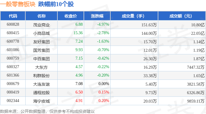 证券之星消息,2月3日一般零售板块较上一交易日上涨0.67%,新华百货领涨。当日上证指数报收于4067.74,上涨1.29%。深证成指报收于14127.1,上涨2.19%。一般零售板块个股涨跌见下表: