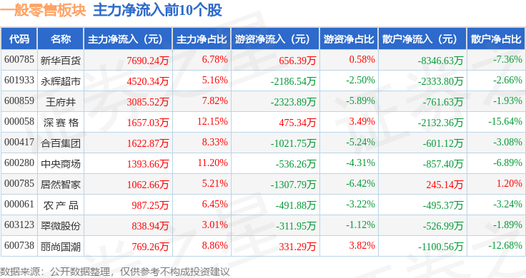 从资金流向上来看,当日一般零售板块主力资金净流出3.85亿元,游资资金净流入1.41亿元,散户资金净流入2.43亿元。一般零售板块个股资金流向见下表: