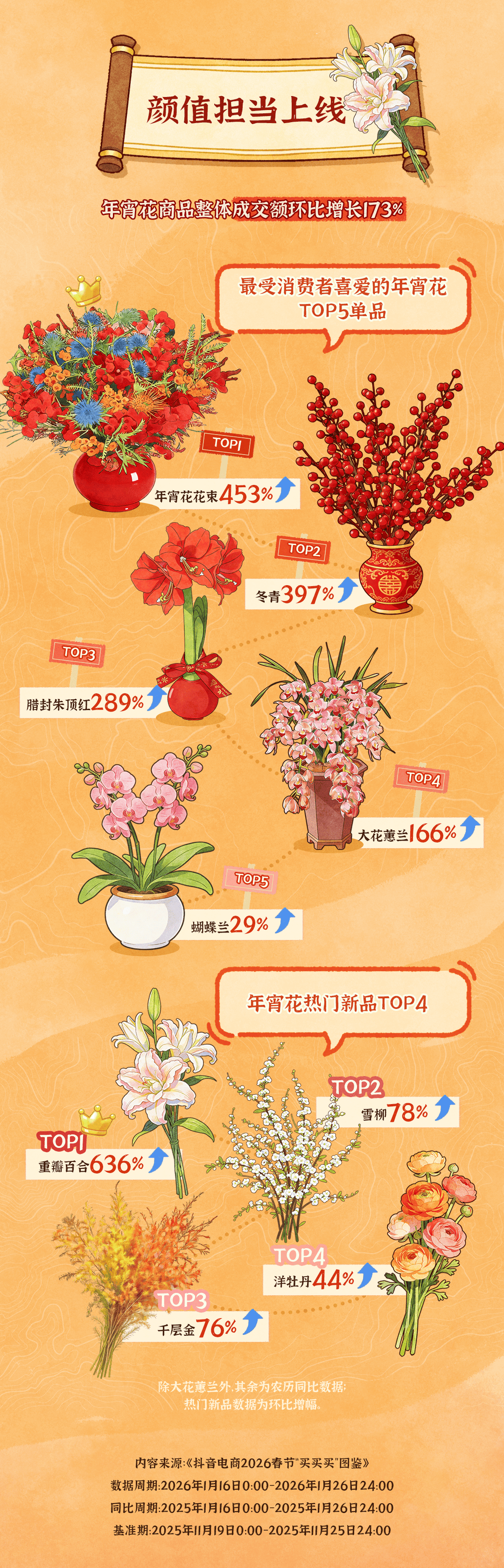 作为“年味氛围组”的重要成员,抖音电商年宵花品类整体环比增长173%。在经典花品延续热度的同时,也涌现出多款人气新品。传统品类中,年宵花鲜切花束、冬青、腊封朱顶红因喜庆外观与美好寓意,成为消费者装点家居的三大首选,成交额同比增长453%、397%和289%;在新品方面,重瓣百合以636%的成交额环比增幅成为“黑马”,雪柳、千层金等则以清新造型,吸引年轻消费者喜爱。