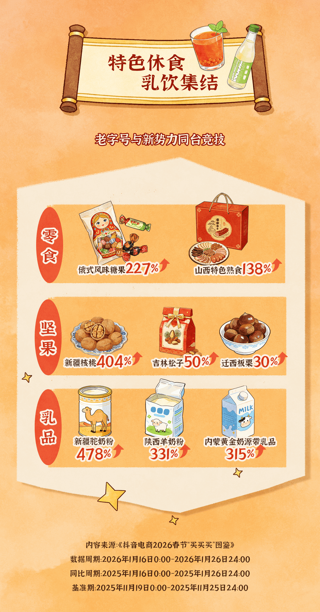 图鉴显示,抖音电商休闲食品与乳品呈现老字号与新势力同台竞技之势,共同推动消费市场繁荣。在零食赛道,俄式风味糖果、山西特色熟食等地域特色产品走红,成交额同比增长227%和138%;在坚果赛道,新疆核桃以高性价比与优质口感领跑,成交额同比增长404%,吉林松子和迁西板栗则凭借“原生态”属性吸引追求健康的消费者,成交额均实现双位数增长;在乳饮赛道,“地域特色乳品”成为增长新引擎,新疆驼奶粉、陕西羊奶粉、内蒙黄金奶源带乳品打破地域限制走向全国。