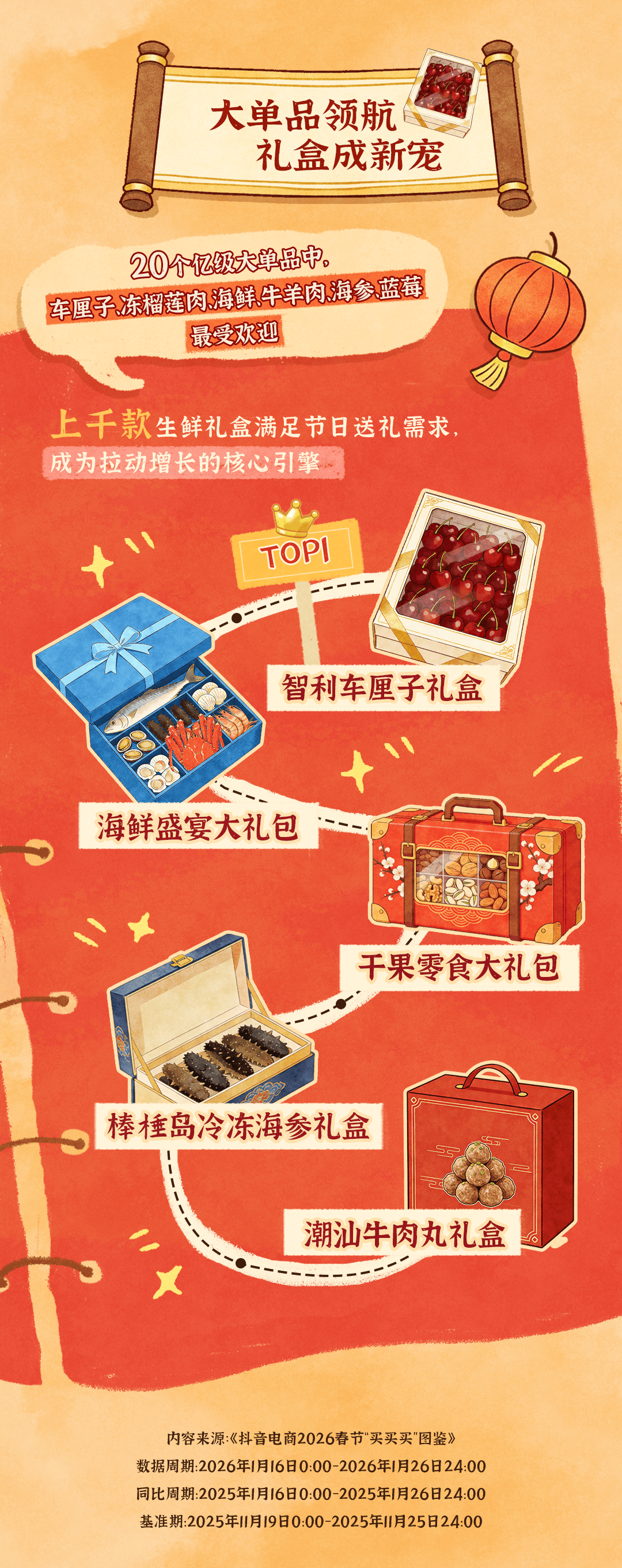 2月2日,抖音电商发布2026“鲜食年货买买买图鉴”(下称“图鉴”),呈现年货节期间平台生鲜消费的亮点数据和大众消费趋势。数据显示,1月16日至1月26日,抖音电商鲜食品类销售迎来全面爆发,不同细分赛道基于用户消费需求变化呈现差异化增长态势。在20个亿级大单品中,车厘子、冻榴莲肉、海鲜礼盒、牛羊肉、海参和蓝莓最受欢迎;上千款生鲜礼盒精准击中节日送礼需求,成为拉动增长的核心引擎。