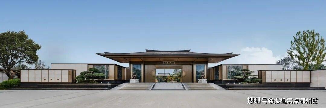 歇山顶的大门,宽约53米(加景墙)、高约10.85米,顶部有微微翘起的鸱尾。景墙高低墙的设计,立体而饱满。两侧高约2米(含基座)、重约600斤铜狮镇宅。气场强大的同时,还颇有诗意。