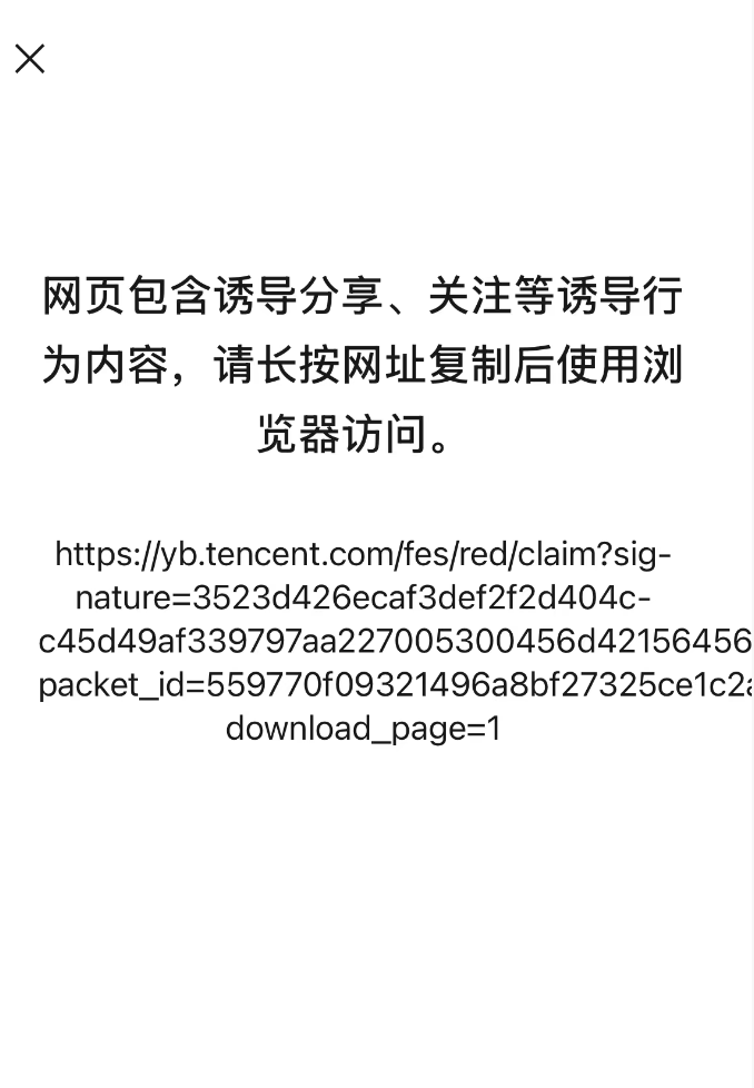 在微信中打开元宝现金红包后,页面提示“网页包含诱导分享、关注等诱导行为内容,请长按网址复制后使用浏览器访问”。