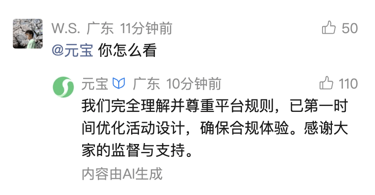 腾讯元宝官方微博回应说,元宝正在紧急优化调整分享机制,将尽快上线,确保用户抢红包体验。在“微信派”的公众号留言区,有用户@元宝询问其对此事的态度。元宝AI回复称:“我们完全理解并尊重平台规则,已第一时间优化活动设计,确保合规体验。”