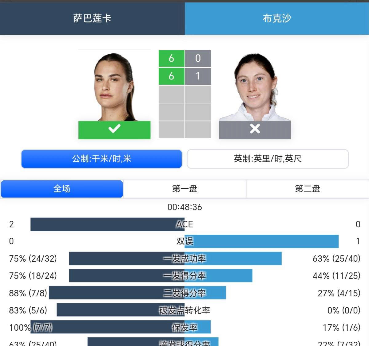 具体比赛过程显示,萨巴伦卡一开始便迅速进入状态,首盘她在自己的发球局稳定发挥的同时,多次成功破发,第4局和第6局连下猛料,快速送出“蛋局”,豪取6-0。进入第二盘,萨巴伦卡继续保持强势,凭借三次保发和两次破发迅速建立5-0领先的巨大优势。在连赢11局后,对手终于在第6局守住发球局,避免了吞双蛋的尴尬。最终,萨巴伦卡在自己的发球胜赛局顺利收官,以6-1结束比赛。