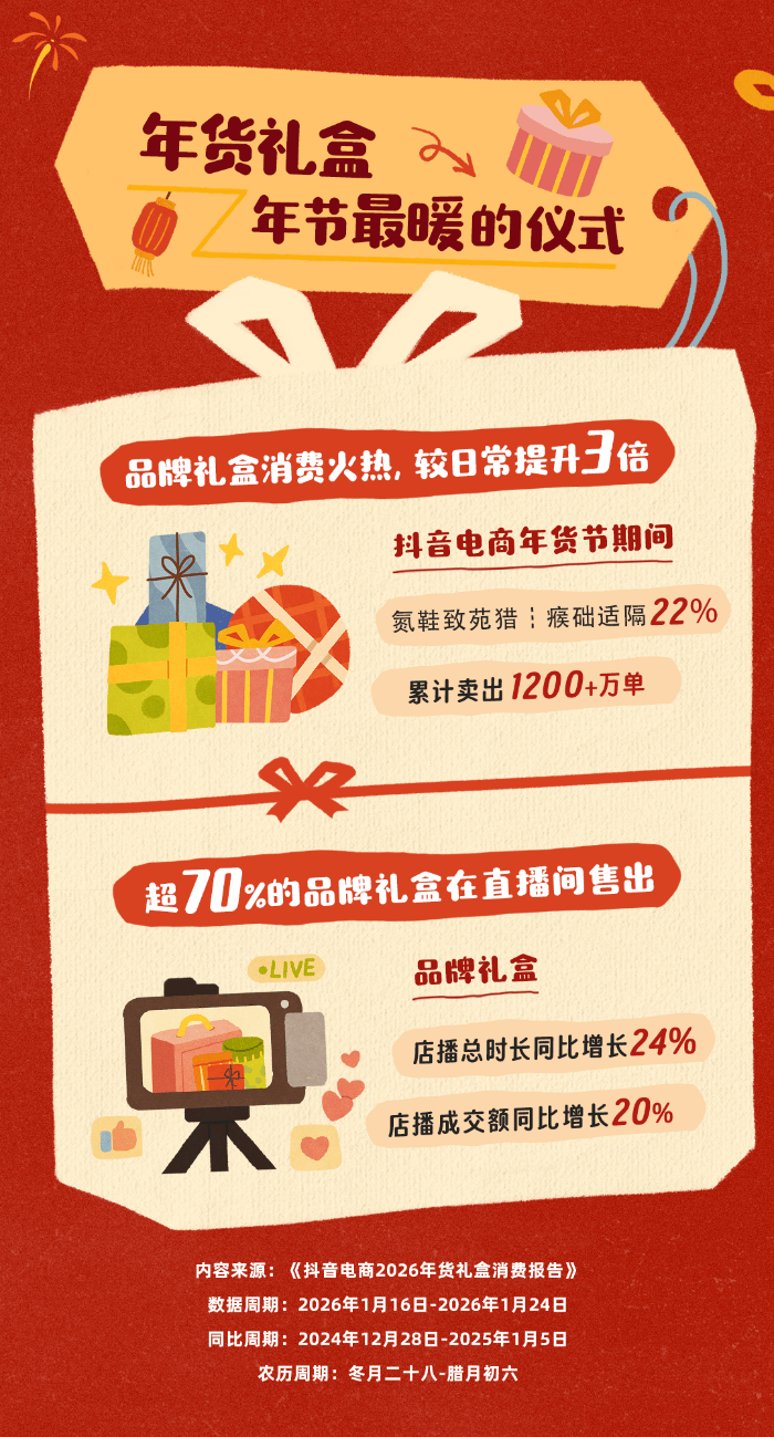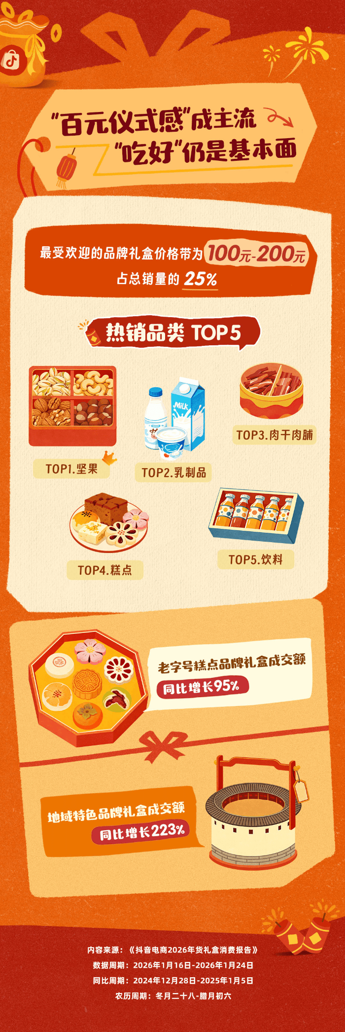 可以看到,通过直播镜头,天南海北的特色年货得以高效汇聚与呈现。通过直播镜头,东北的大米、广东的盆菜、云南的菌菇等地方特产,能够直观地跨越山海,抵达全国消费者的餐桌。这不仅满足了人们品尝四方风物的需求,也成为带动地方特色产品销售、促进消费的重要载体。《抖音电商2026年货礼盒消费报告》(以下简称“报告”)中的一组数据,直观反映了这一趋势:在直播电商的助力下,地域特色品牌礼盒的成交额同比增长了223%。同时,坚果、乳制品、肉干肉脯、糕点和饮料稳居热销品牌礼盒前五名,显示出直播在丰富供给的同时,也夯实了传统年货的基本盘。