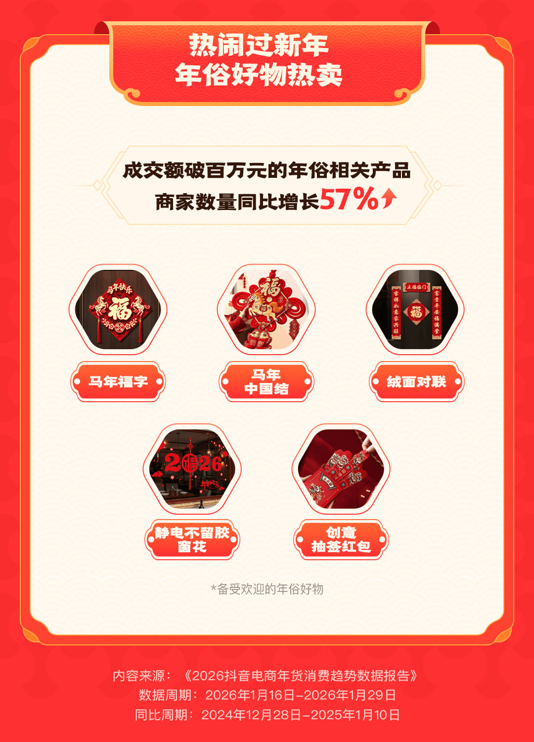 此外,带有节日氛围的装饰类商品同样热销。成交额破百万元的年俗相关产品商家数量同比增长57%,马年福字、中国结、绒面对联、静电窗花、创意抽签红包等年俗商品,成为不少家庭布置节日环境的选择。