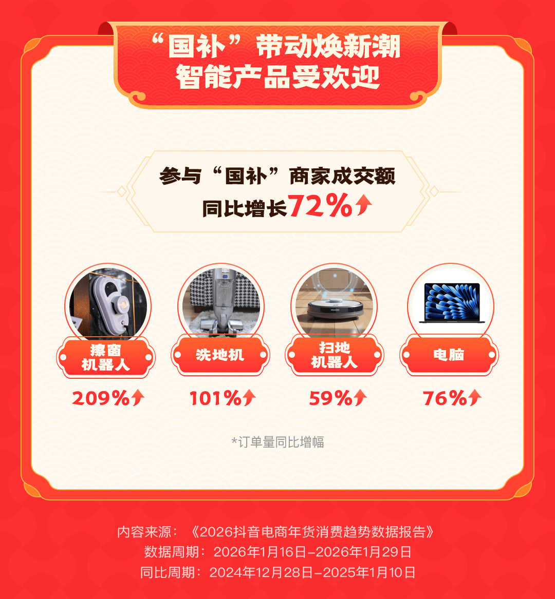 在居家生活方面,智能清洁电器和数码产品订单量增长明显。擦窗机器人的订单量同比增长209%,洗地机、扫地机器人的订单量分别同比增长101%、59%,电脑订单量同比增长达到76%。在换新需求带动下,平台上参与“国补”的商家成交额同比增长72%。春节前后,不少家庭选择在这一时间节点更换家电和智能设备,改善居家环境。