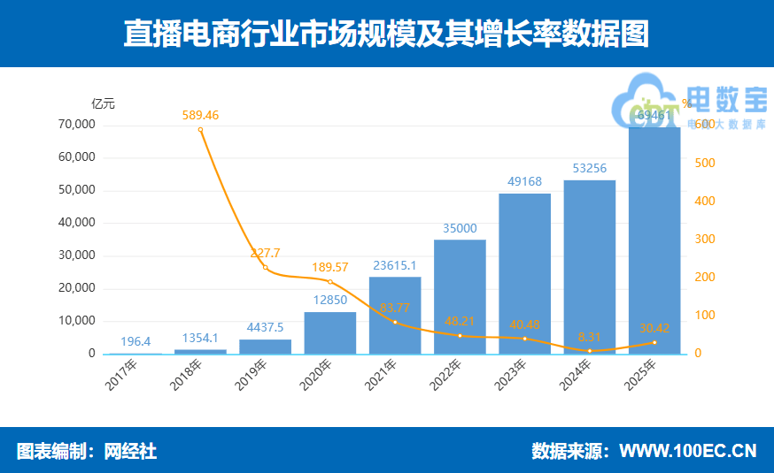 据电商大数据库“电数宝”显示,2025年直播电商交易规模达到69461亿元,同比增长30.42%,增速回升。