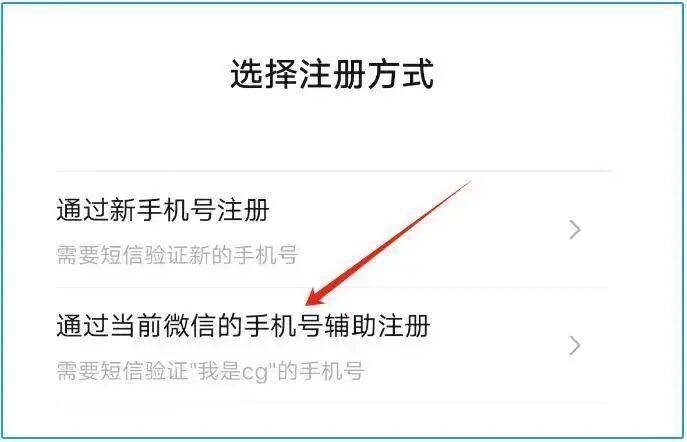 3.这个时候,我们点击“注册新账号”,在选择注册方式这里,我们直接选择“通过当前微信的手机号辅助注册”。