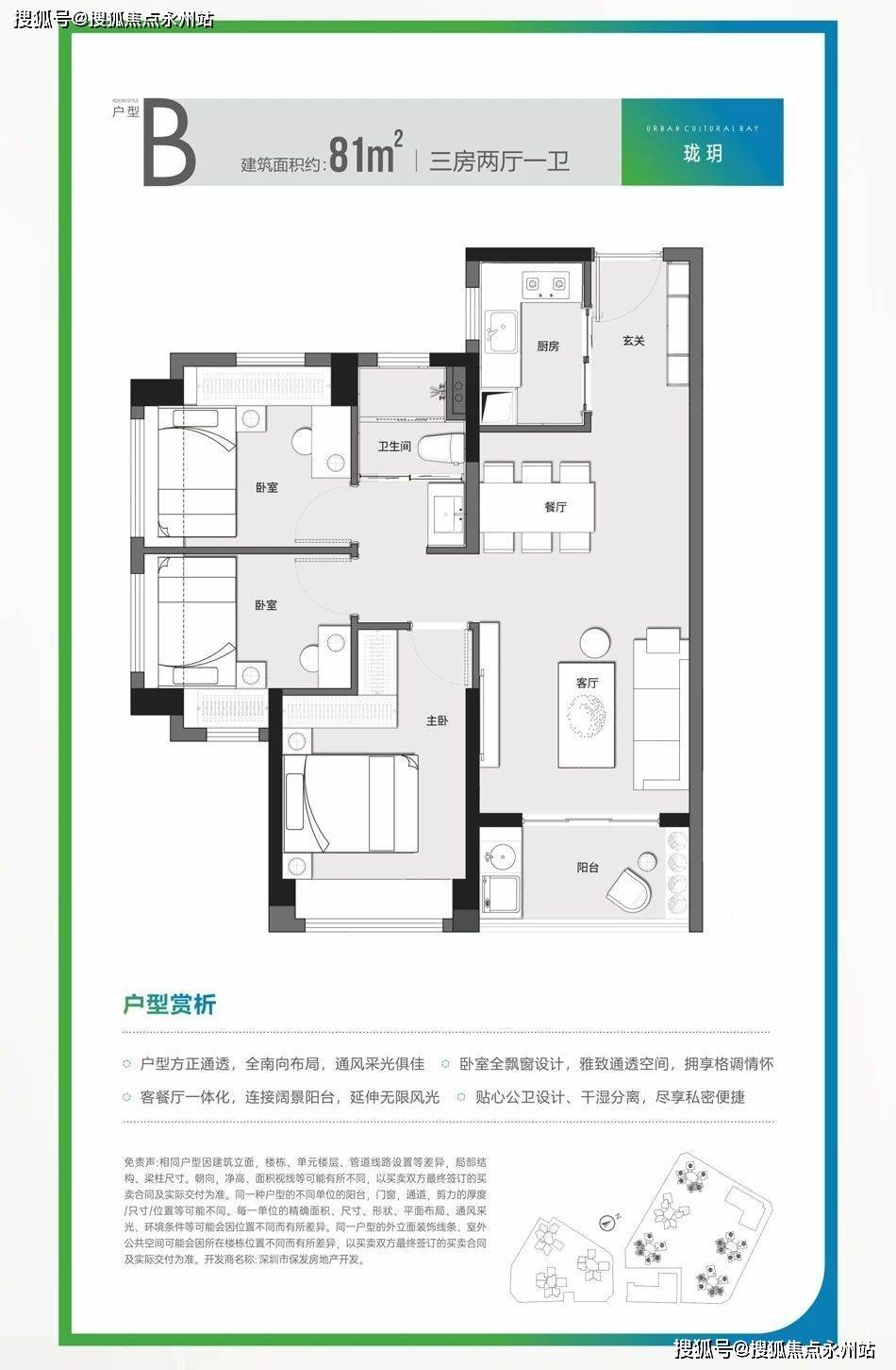 约81㎡三房一卫(1栋2单元05/06户型、3栋1单元03/04户型、3栋2单元02/05/06户型、5栋01/03/04户型)竖厅格局,餐客一体,动静分区结构,卫生间干湿分离设计,有东南朝向和西南朝向。