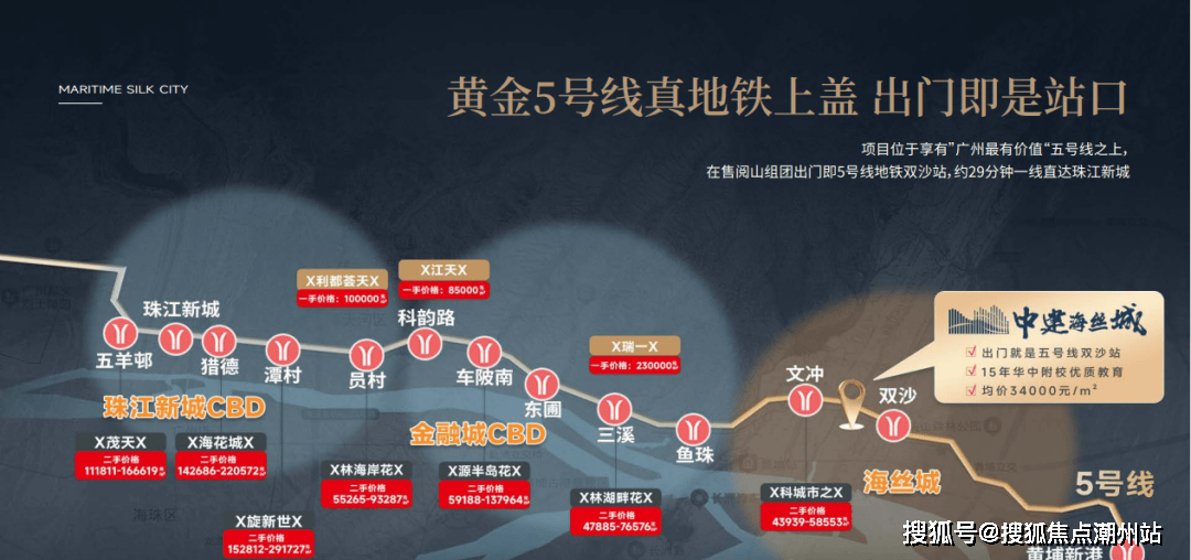中建海丝城交通配套;项目是临港经济区的重要功能节点,双沙旧改地块众多,首开区具体位置在5号线双沙地铁站B口附近,与地铁5号线双沙站的直线距离仅约50米,与地铁13号线双岗站直线距离也不到500米,双地铁站护航,交通条件优越,从项目出发,2站到鱼珠CBD,5站金融城,6站琶洲东区,10站直达珠江新城,囊括广州最重要的几个CBD。自驾的话,广州绕城高速、广深沿江高速等各大要道在此纵横,路网四通八达,主打高效快速。