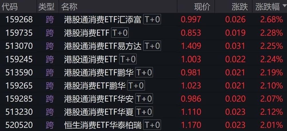 受盘面影响,港股消费相关ETF涨超2%。