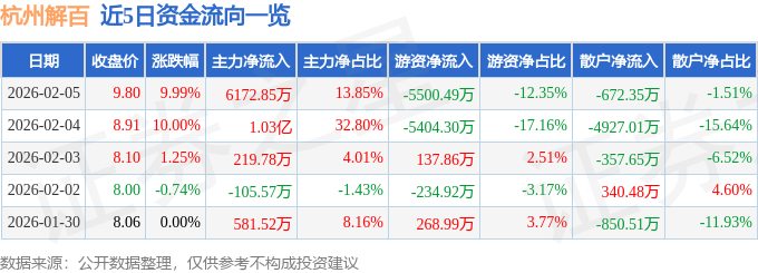 2月5日的资金流向数据方面,主力资金净流入6172.85万元,占总成交额13.85%,游资资金净流出5500.49万元,占总成交额12.35%,散户资金净流出672.35万元,占总成交额1.51%。