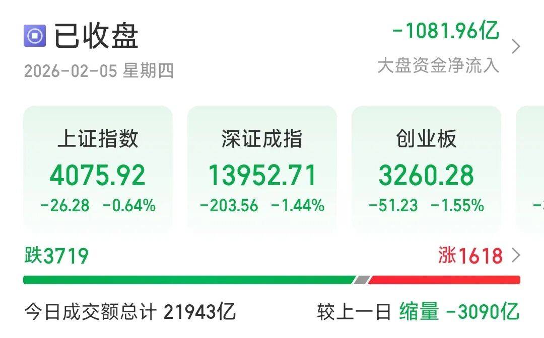 2月5日,A股三大指数集体下跌。截至收盘,沪指跌0.64%,深成指跌1.44%,创业板指跌1.55%,北证50指数跌2.03%。沪深京三市成交21943亿元,较上一日缩量3090亿元,三市超3700只个股下跌。