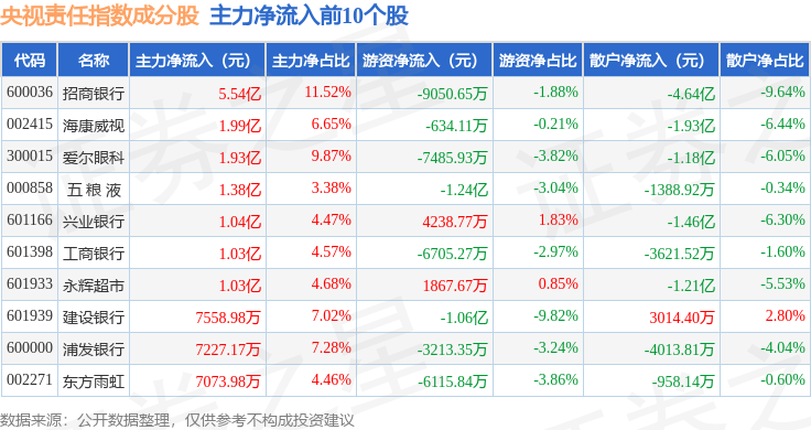 资金流向方面,央视责任(399555)指数成份股当日主力资金净流出合计5.48亿元,游资资金净流入合计2.19亿元,散户资金净流入合计3.28亿元。成份股资金流向详情见下表: